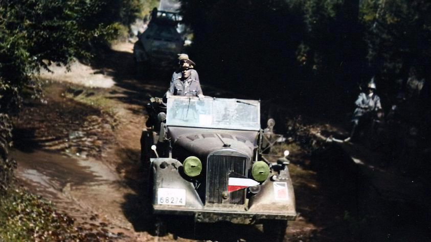 He stands in his Horch 901 staff car, a versatile and common military vehicle used by the German army throughout the war, with approximately 15,000 units produced.